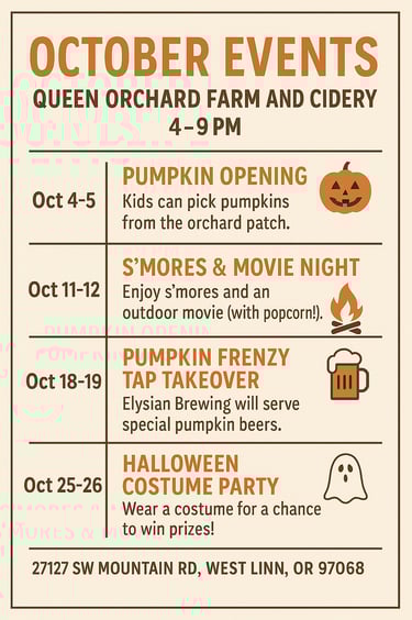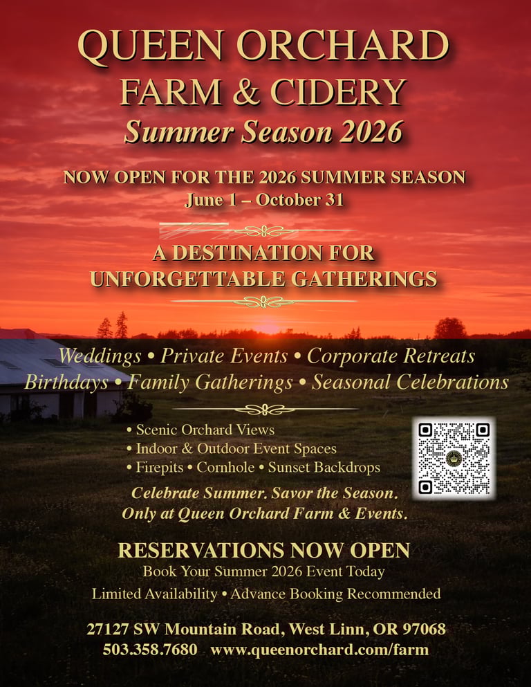 Nestled within a 65-acre working orchard in West Linn, Oregon, Queen Orchard Farm & Cidery offers a truly enchanting setting for weddings, corporate retreats, private gatherings, and seasonal celebrations. From exchanging vows beneath the orchard canopy to gathering with friends around crackling fire pits, every moment is steeped in natural beauty and heartfelt connection. Complementing this experience, Queen Orchard and 7Bev Brewing bring together the best of craft and hospitality—offering farm-to-glass tastings, premium ciders, and artisanal beers in an authentic yet elevated environment that celebrates the spirit of Oregon.